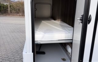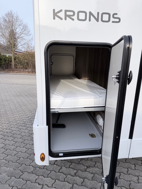 Für die Fahrt oder wenn es nicht benötigt wird, lässt sich das untere Bett wegklappen und die entstehende Öffnung verschließen, sodass die Heckgarage perfekt genutzt werden kann.